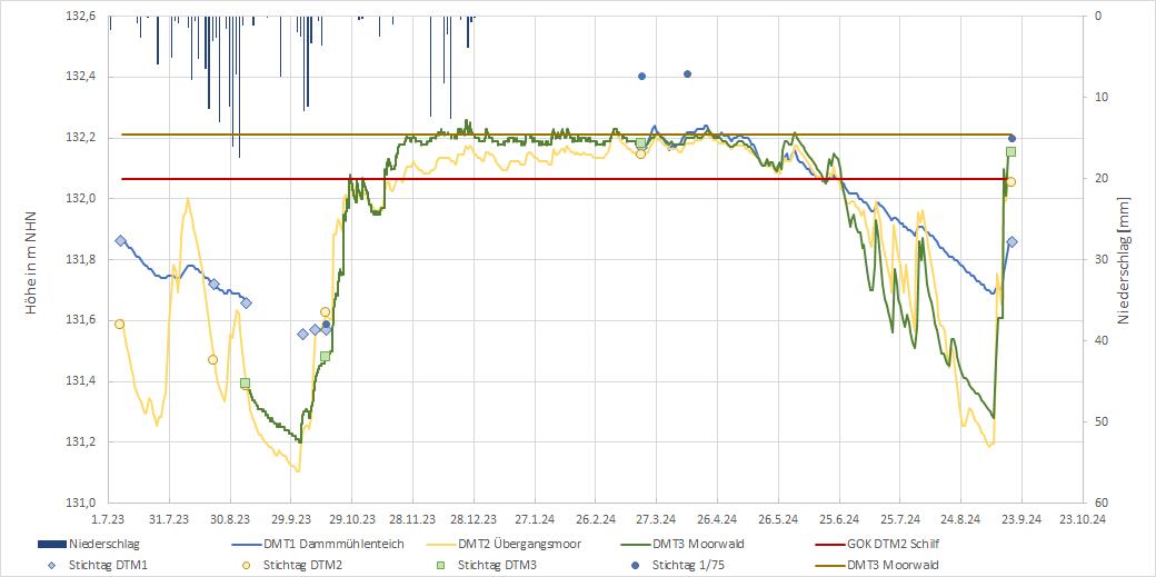 - Gegenüber 2023 scheint das Moor etwas später auszutrocknen, da die tiefen Werte von Anfang Juli 2023 im Jahr 2024 erst einen Monat später erreicht wurden, obwohl das Frühjahr 2024 ausgesprochen trocken war. Ende August/Anfang September 2024 wurden allerdings wieder Wasserstände von mehr als 80 cm unter Flur erreicht, was für ein Moor definitiv zu niedrig ist.