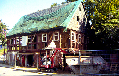 - abschnittsweiser Ausbau und Entsorgung des geschädigten Altholzes im Bereich des Außenwandfachwerkes des EG und OG, im Bereich der Decken (vor allem der Auflagerbereiche) und im Bereich des Dachstuhles (vor allem der Sparrenfüße sowie betreffend die Giebelgebinde),